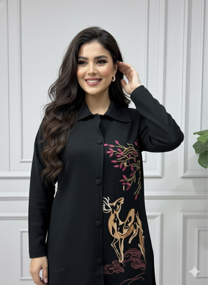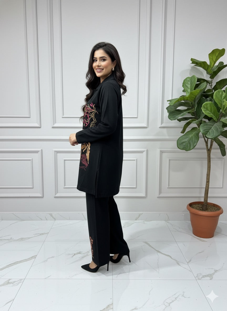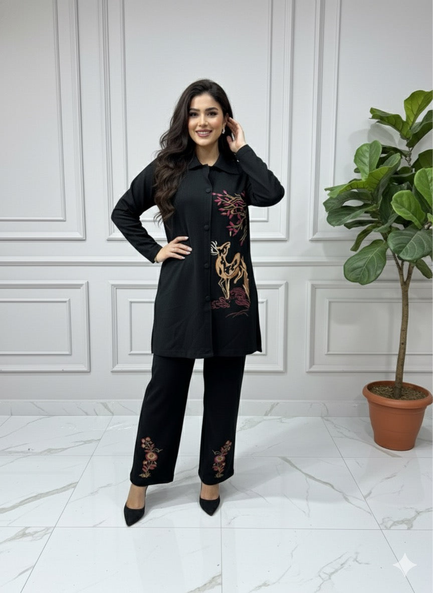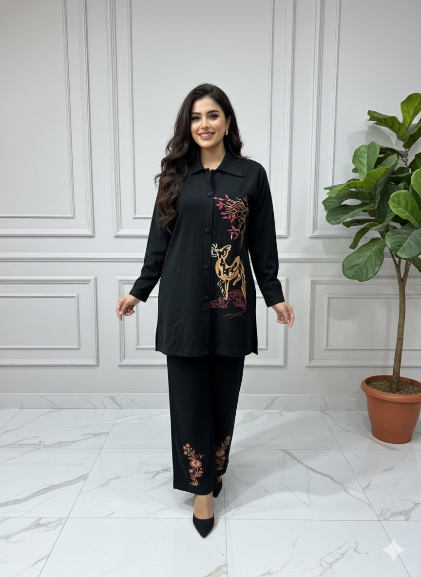 The richness of the solid black background is beautifully contrasted by intricate Gold and Crimson Embroidery. A majestic Stag Motif adorns the front placket of the button-down tunic, while coordinating delicate floral embroidery graces the cuff of the wide-leg trousers.