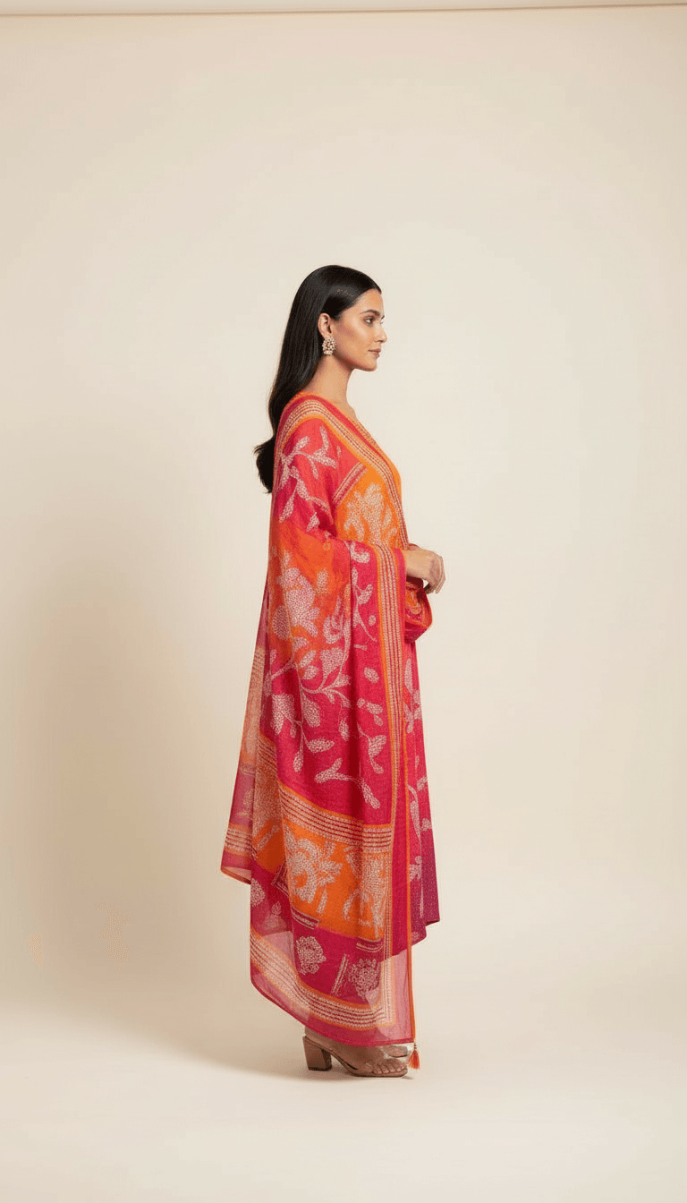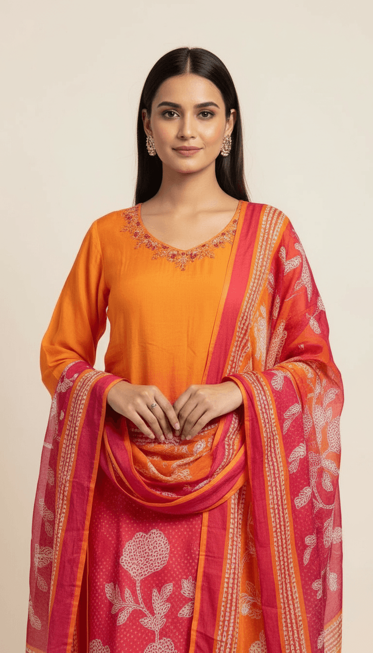 Radiate warmth and elegance with our Sunset Bloom Viscose Crape Suit, a vibrant masterpiece designed for the modern woman who loves a fusion of bold color and delicate artistry. Crafted from premium viscose crape fabric, this ensemble offers a soft, fluid drape that feels exceptionally luxurious against the skin while ensuring all-day comfort.
