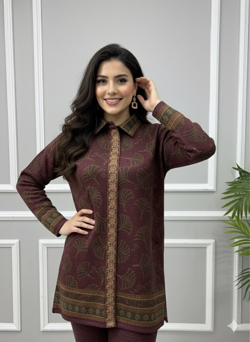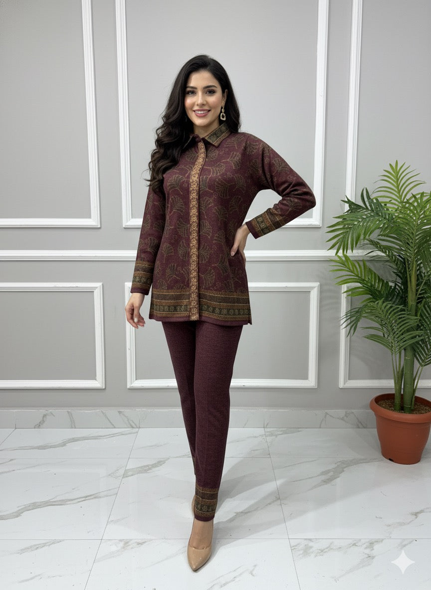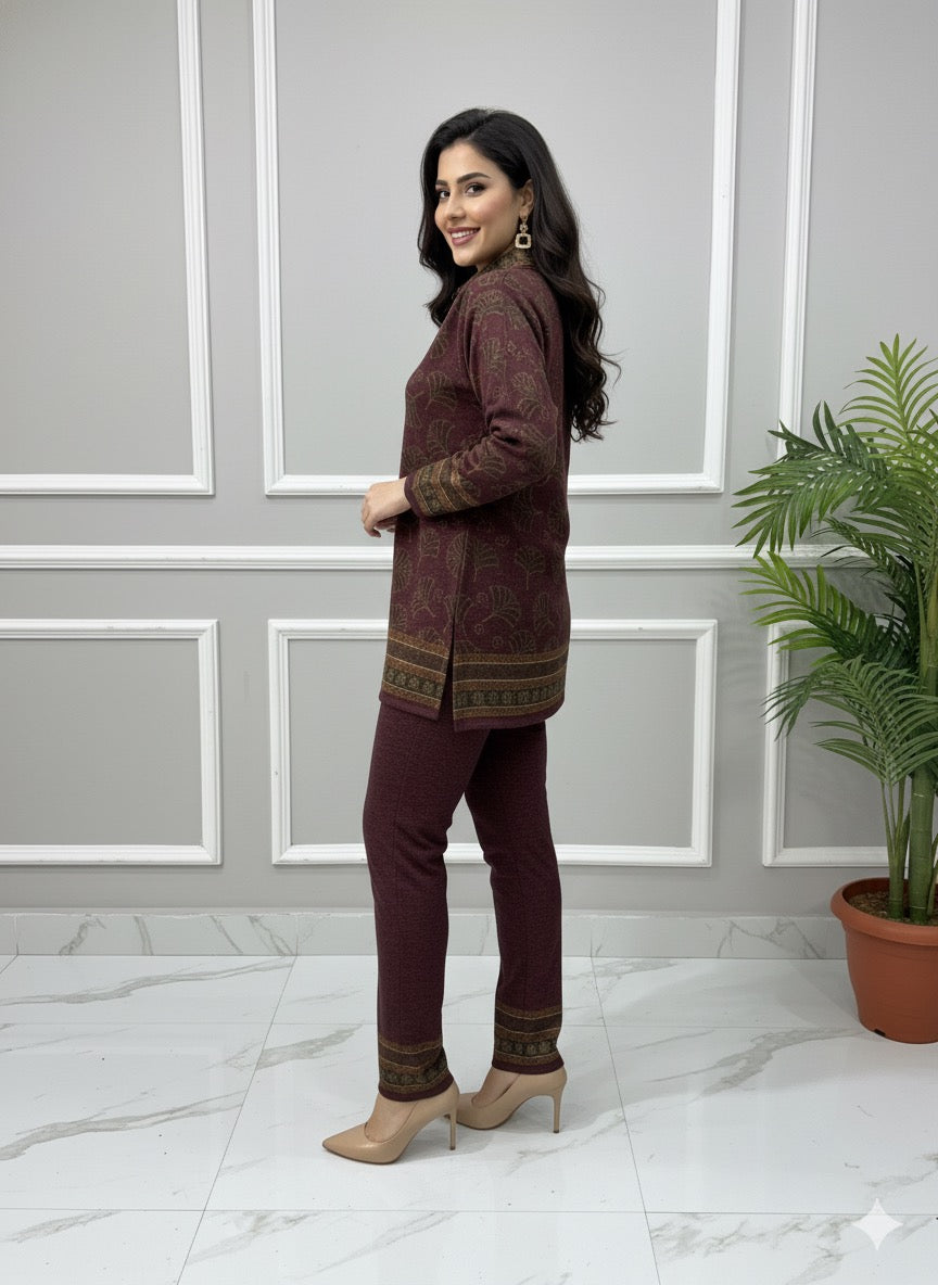 Meet the knitwear that looks and feels like a luxury find. Our Wine Tapestry Daffodil Coord Set is the essential winter outfit for those who refuse to choose between rich style and warm comfort.